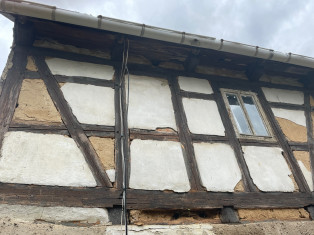Wohnhaus: Durch Feuchteeintrag über das undichte Dach erhebliche Schäden an der Holzkonstruktion, insbesondere am Dachtragwerk und den Geschossbalkendecken. Größere Fehlstelle im Gefach im 1. OG (Nordseite). Aufsteigende Feuchtigkeit im Erdgeschoss. Die Scheune ist gut erhalten, das Dach ist dicht.